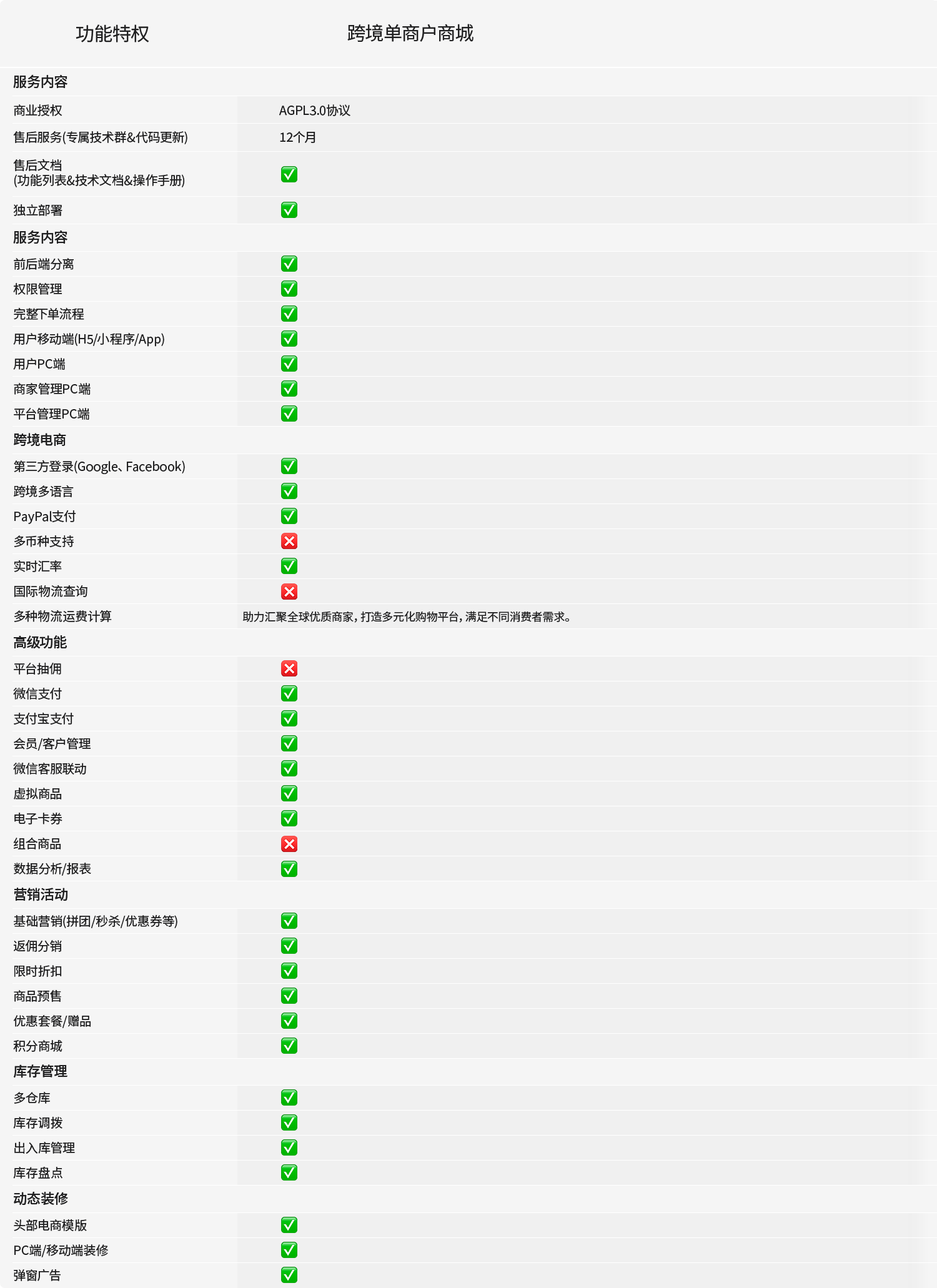 | 功能特权 | 开源版 | 黄金版 B2C商城 |